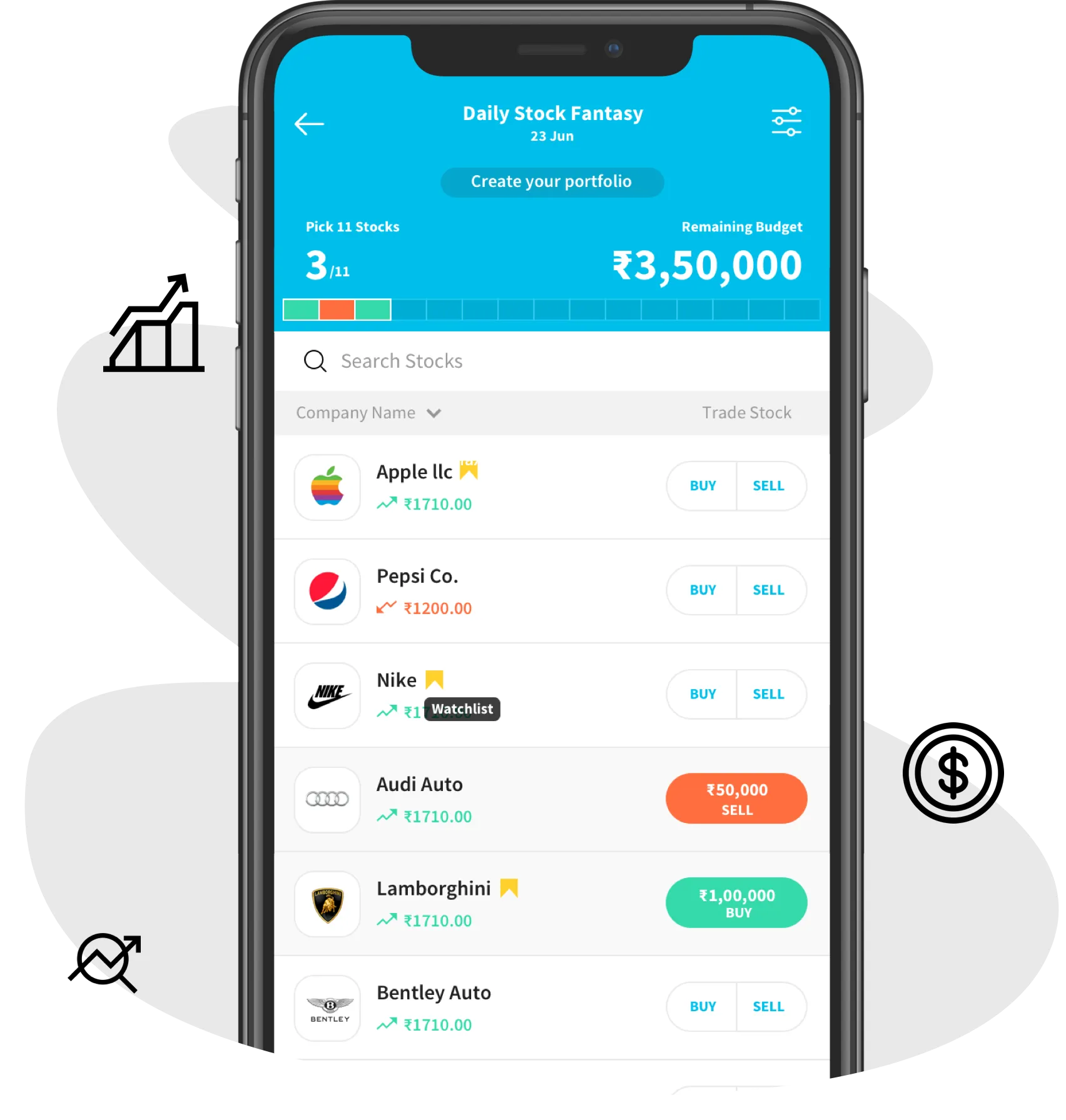 Users can add stocks in the watchlist to keep a track of stocks they want to buy/sell.